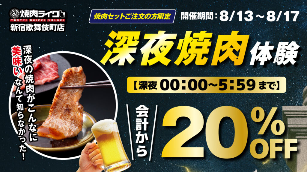 焼肉ライク初の24時間営業である新宿歌舞伎町店で深夜の焼肉の楽しさを多くの方に知っていただきたいという想いから、8/13~8/17の5日間限定で深夜00:00~05:59の間に焼肉セットをご注文いただいたお客様を対象にお会計から20%OFFになるキャンペーンを実施いたします。仕事終わりや飲み会終わりなど、様々なシーンでお楽しみください。