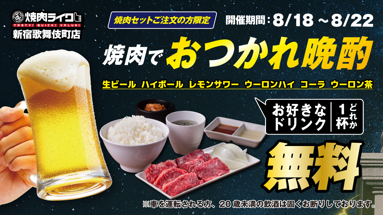 日頃たまった疲れを少しでも癒していただくため、焼肉ライク新宿歌舞伎町店では8/18~8/22の5日間限定で焼肉セットをご注文いただいたお客様全員に「お好きなドリンク1杯無料」キャンペーンを実施します!