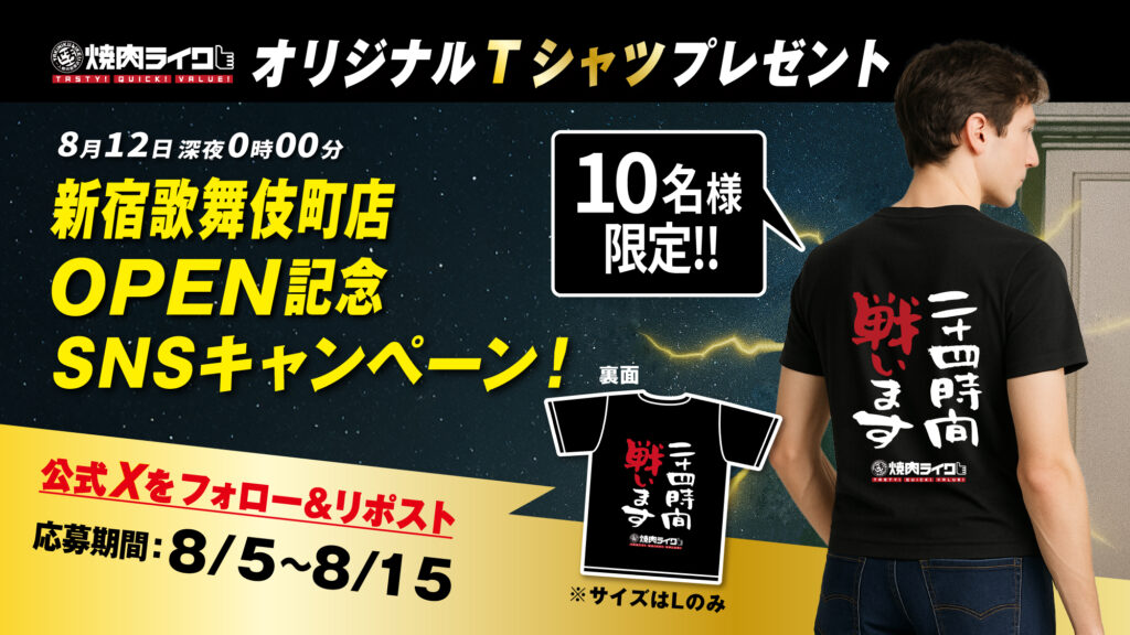 焼肉ライク 新宿歌舞伎町店のOPENを記念して、「焼肉ライクオリジナルTシャツ」が当たるキャンペーンを実施します。皆様のご応募お待ちしております!