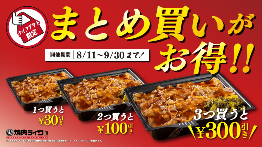 リニューアルに合わせて、買えば買うほど安くなる「まとめ買いもお得キャンペーン」を実施し、焼肉ライクのおいしさが詰まった焼肉弁当を、一人でも複数人でもお気軽にお得にお楽しみいただけます。ぜひこの機会にお試しください!