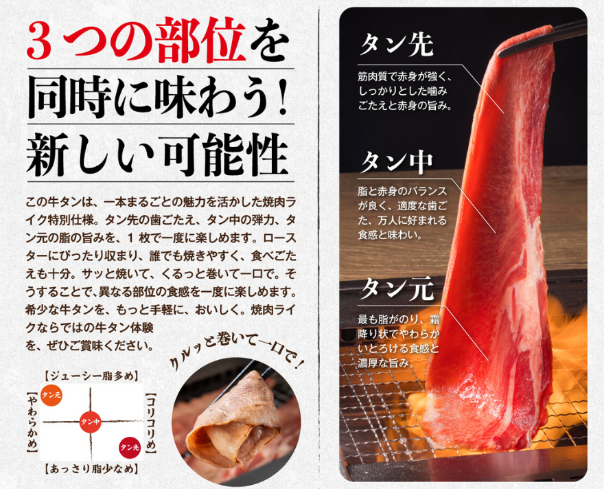 タン先の噛みごたえと赤身の旨み、タン中のバランスの取れた食感と味わい、そしてタン元のやわらかくとろける食感と濃厚な脂の旨みを、1枚で一度に味わえるよう仕上げました。